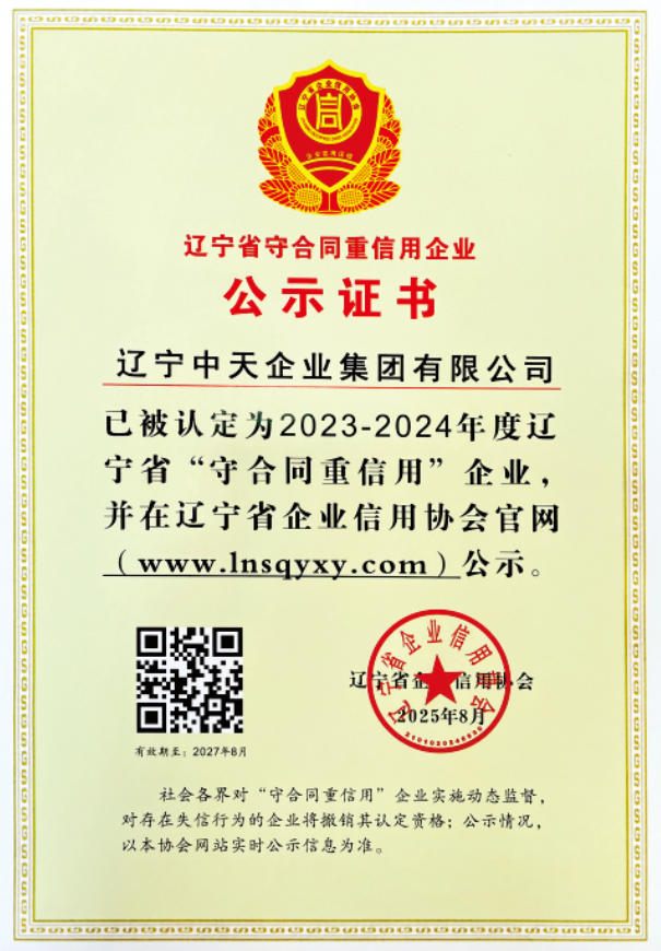 近日,中天集團(tuán)憑借卓越的商業(yè)信譽(yù)和嚴(yán)謹(jǐn)?shù)穆募s能力,被遼寧省企業(yè)信用協(xié)會認(rèn)定為2023-2024年度遼寧省“守合同重信用”企業(yè)和信用等級5A級企業(yè),這是集團(tuán)自2005年以來連續(xù)20年獲此殊榮。這一榮譽(yù)不僅是對集團(tuán)長期以來堅(jiān)持誠信經(jīng)營的高度認(rèn)可,更是對企業(yè)在打造品牌、服務(wù)社會方面不懈追求的充分肯定。